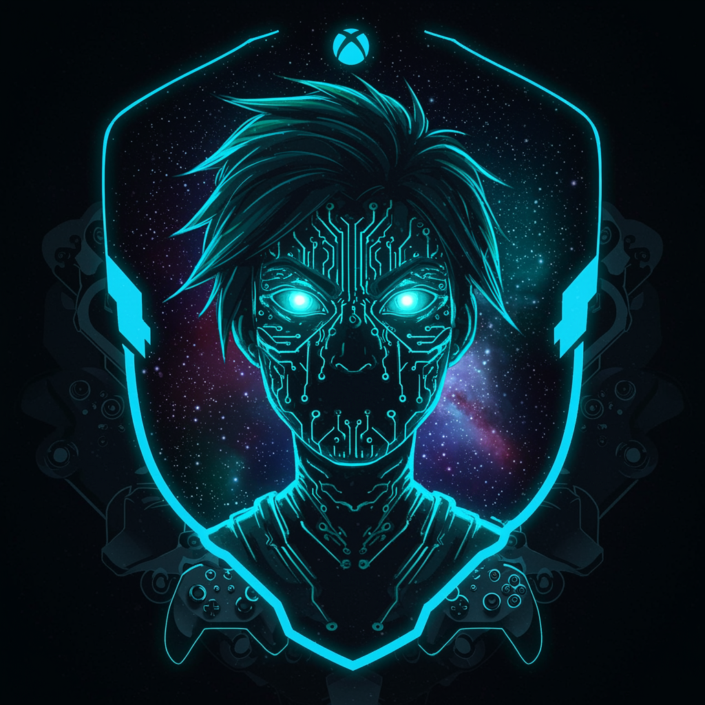 An enigmatic gamer persona encapsulated in a digital realm, featuring an electrifying fusion of neon blue and green circuitry intertwined, forming the silhouette of Jynxzi, the mystical guardian of virtual realms. Their eyes, vivid portals of cosmic energy, gaze into the distance with an expression of fierce determination and mischievous wit, set against a backdrop of pixelated galaxies. The pfp is bordered by sleek, metallic Xbox controller motifs, hinting at their prowess and connection to the world of gaming.