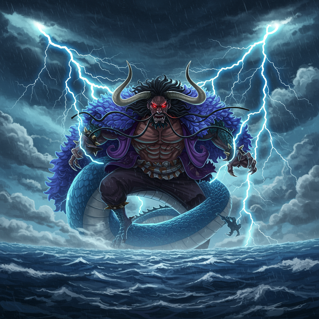 Imagine a powerful and enigmatic profile picture featuring Kaido, the renowned One Piece character, poised majestically on a stormy seas backdrop. His dragon form coils dramatically in the sky, exuding a fierce aura of dominance and strength. Lightning crackles around his form, illuminating his vibrant blue scales and fierce, piercing red eyes that convey both wisdom and fearlessness. Wisps of storm clouds swirl around him, hinting at the tempest of emotions he harbors. The energy of the scene is palpable, capturing the essence of a formidable figure who commands respect and awe in the world of anime.