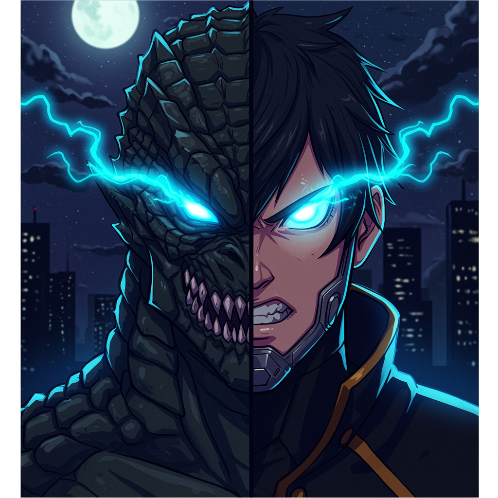 A dynamic profile picture concept featuring a stylized interpretation of Kafka Hibino's transformation from "Kaiju No. 8," showcasing a half-human, half-kaiju visage with vivid, electric blue eyes glowing fiercely against a backdrop of a moonlit cityscape; the kaiju side exudes power with intricate, textured scales, while the human side reflects a sense of determination and resilience, seamlessly blending the dual nature of protector and monster in a striking, balanced composition.