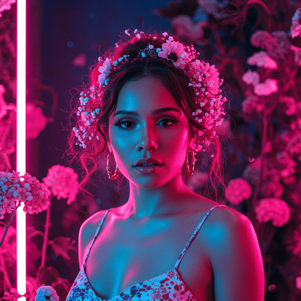 "Imagine a whimsical portrait for a profile picture that embodies the ethereal essence of Kali Uchis; a dreamlike scene where she stands in a vibrant surreal garden under the soft glow of neon lights, cascading pink and blue hues illuminate her features, her hair adorned with delicate wildflowers that mirror the enchanting environment, a gentle breeze swirls around carrying whispers of her soulful melodies, her expression is a blend of confidence and mystique, inviting viewers into a world rich with creativity and depth."