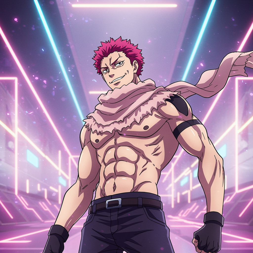 Create an image for a pfp that captures the essence of Katakuri, featuring his distinctive mochi-covered physique transformed into an abstract digital art form. The composition should have swirling pastel hues reflecting his fluid actions, with subtle hints of his iconic scarf and menacing, yet calm gaze looking towards the horizon. Incorporate elements of a futuristic environment, with geometric shapes and soft neon glows, giving a sense of power and mystery that perfectly encapsulates his formidable presence.