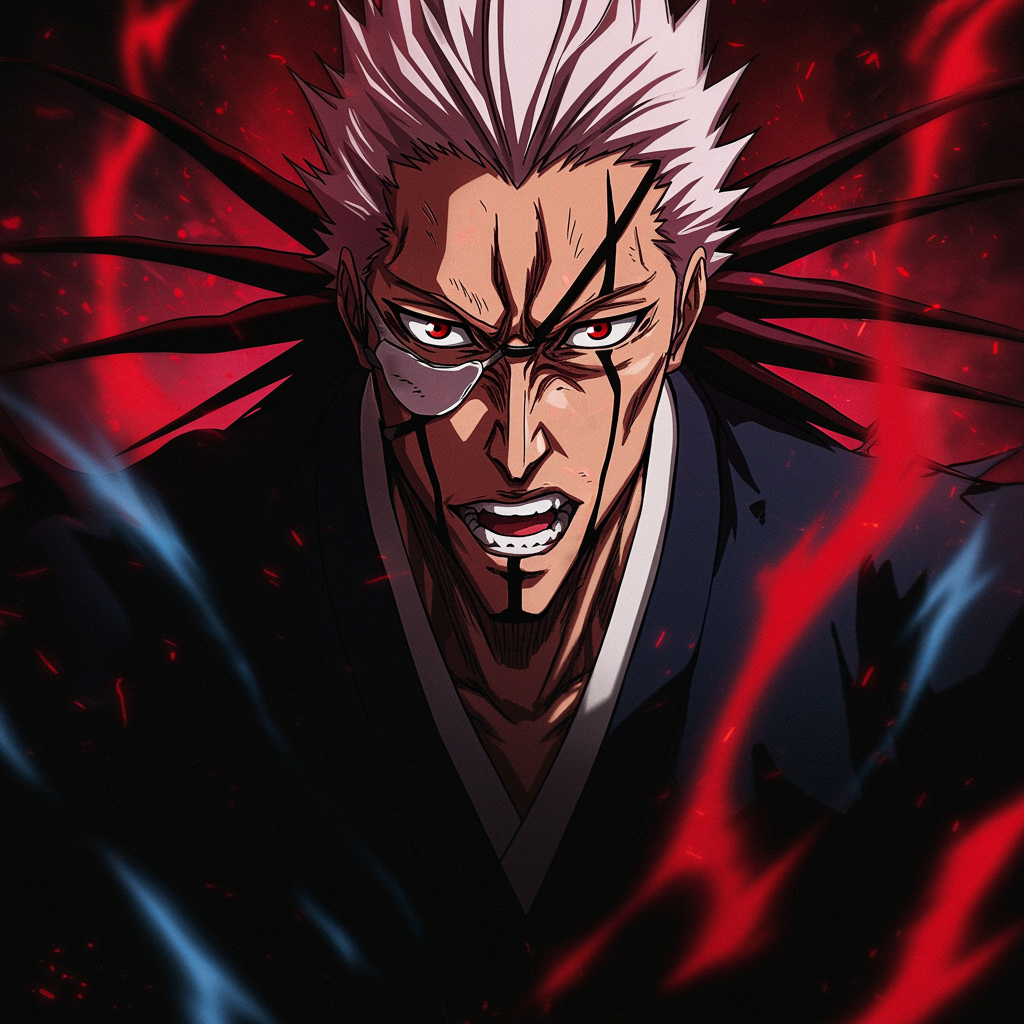 A gritty, dynamic profile picture featuring Kenpachi Zaraki from Bleach, captured in a fierce battle stance. His intense, wild eyes and signature eye patch convey an aura of unstoppable energy, while his jagged, spiked hair dances like flames in a gust of wind. The background is a whirlwind of swirling spiritual energy, imbued with shades of deep red and electric blue, symbolizing his formidable power and indomitable will. The edges of the image are slightly blurred, creating a sense of motion and highlighting the raw intensity of Kenpachi's presence.