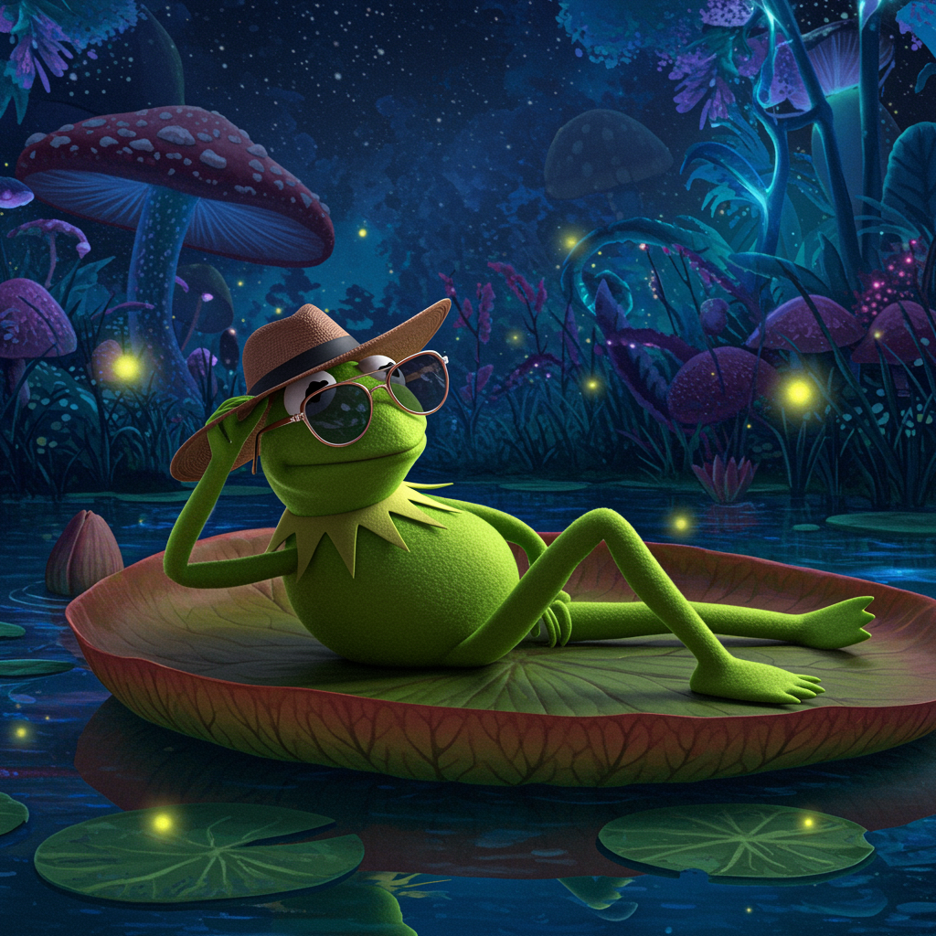 Imagine a whimsical digital artwork featuring a playful Kermit the Frog lounging on a giant lily pad in a tranquil, enchanted pond. He sports trendy, oversized sunglasses, and a jaunty fedora tilted at an angle, exuding an air of laid-back coolness. The gentle glow of bioluminescent fireflies dances around him, casting a soft, magical light on his iconic green skin. In the background, fantastical, towering mushrooms and ethereal, colorful flora stretch up into a twilight sky dotted with shimmering stars, creating a dreamy, otherworldly atmosphere. This scene captures Kermit's charm and humor, making it a perfect and unique pfp.