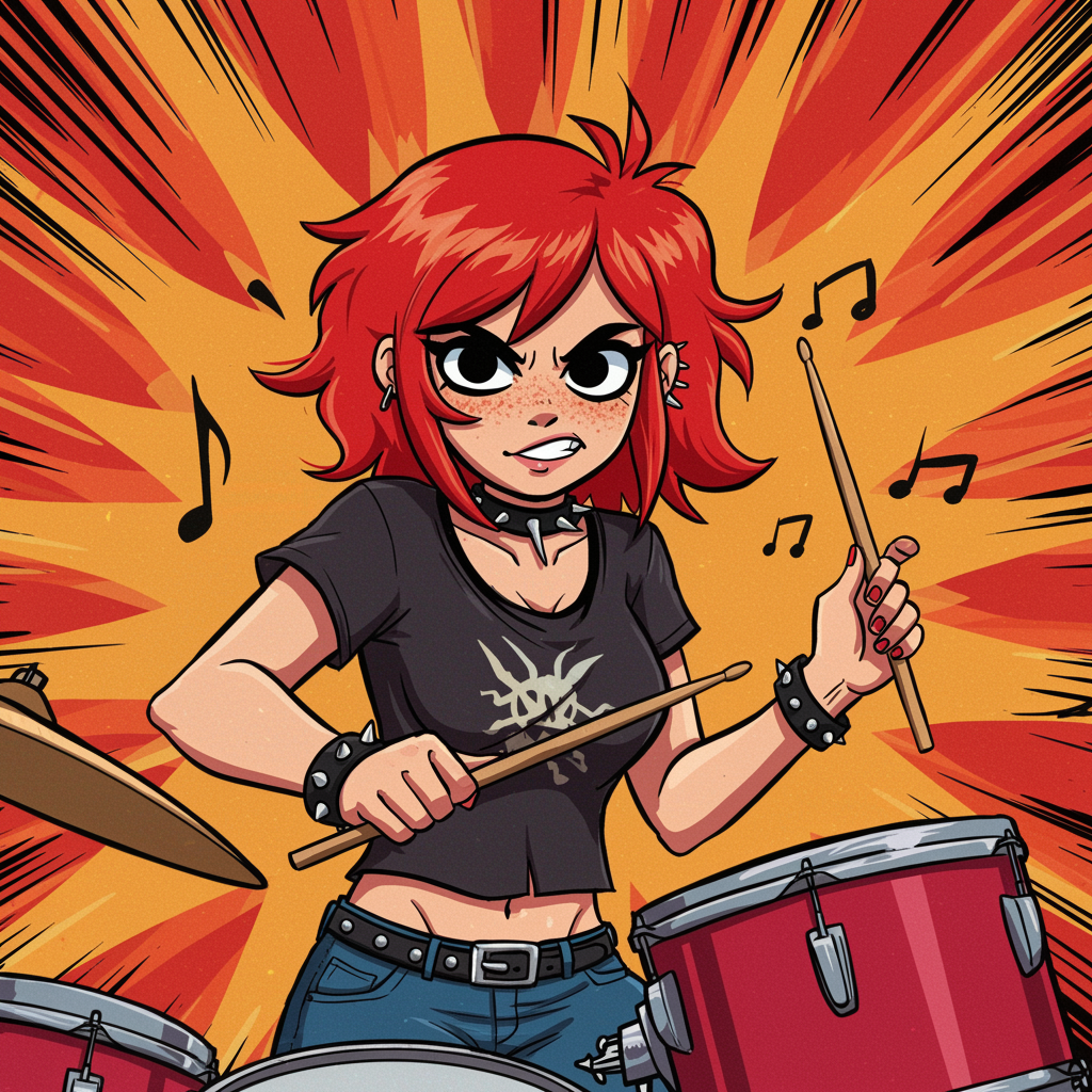 A vibrant and edgy profile picture inspired by Kim Pine from Scott Pilgrim, depicting a confident young woman with fiery red hair and intense eyes, holding drumsticks like a maestro of rhythm. Set against a backdrop of dynamic comic book-style action lines, her expression is a mix of determination and playful rebellion, surrounded by subtle musical notes that capture her essence as a drummer. Her style is bold and eclectic, featuring a vintage band tee and skinny jeans, embodying the spirit of indie rock with a hint of mischievous charm.