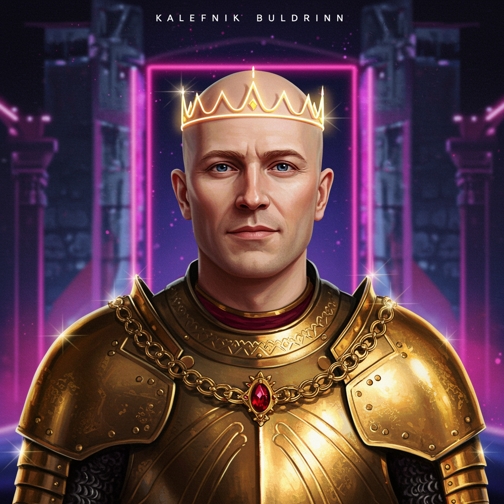 A regal profile picture featuring King Baldwin in a modern digital art style; he stands adorned in resplendent golden armor with intricate patterns, his serene gaze reflecting wisdom and strength; his bald head is crowned with an elegant, minimalist crown sparkling in the digital ether; the background is a fusion of medieval and futuristic elements, blending ancient castle motifs with glowing neon highlights; an aura of majesty and timelessness permeates the image, encapsulating the essence of a legendary ruler in a contemporary context.
