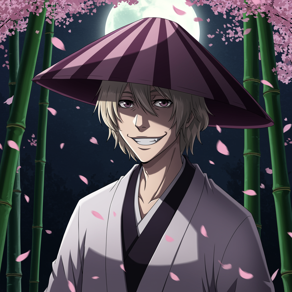 An enigmatic Kisuke Urahara standing in a moonlit bamboo grove, his iconic striped hat casting mysterious shadows across his face, his sly grin and twinkling eyes suggesting hidden knowledge, while soft cherry blossom petals drift gently around him, offering a serene yet intriguing aura that captivates and invites a closer look for the perfect pfp.