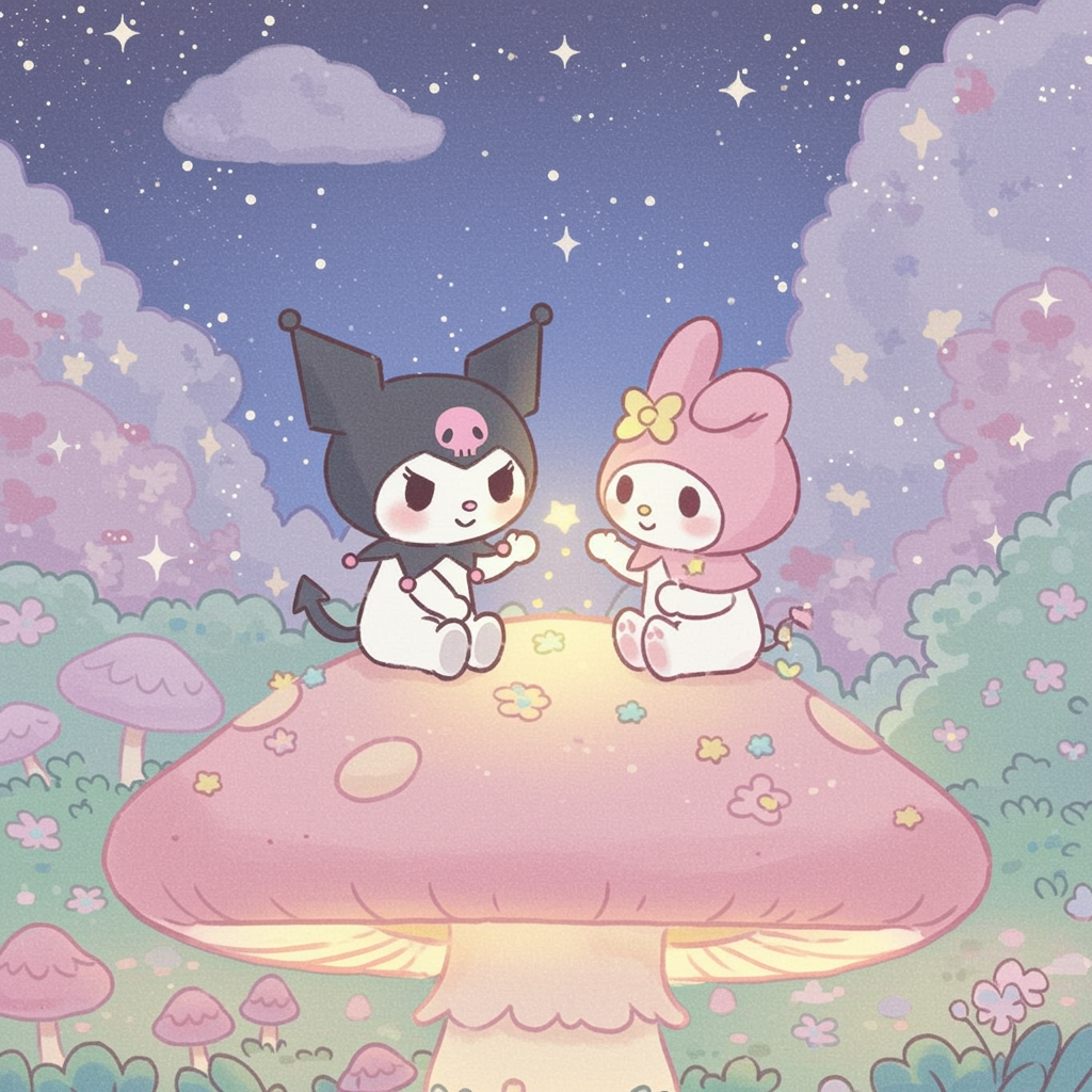 A whimsical scene featuring Kuromi and My Melody in a pastel-colored, enchanted forest where Kuromi, with her mischievous grin and spiky black ears, playfully teases a serene My Melody dressed in her signature pink hood; the two sit on a giant, glowing mushroom underneath a starry sky, their contrasting personalities harmonizing in a gentle dance of friendship and whimsy, capturing the essence of connection in a magical world.