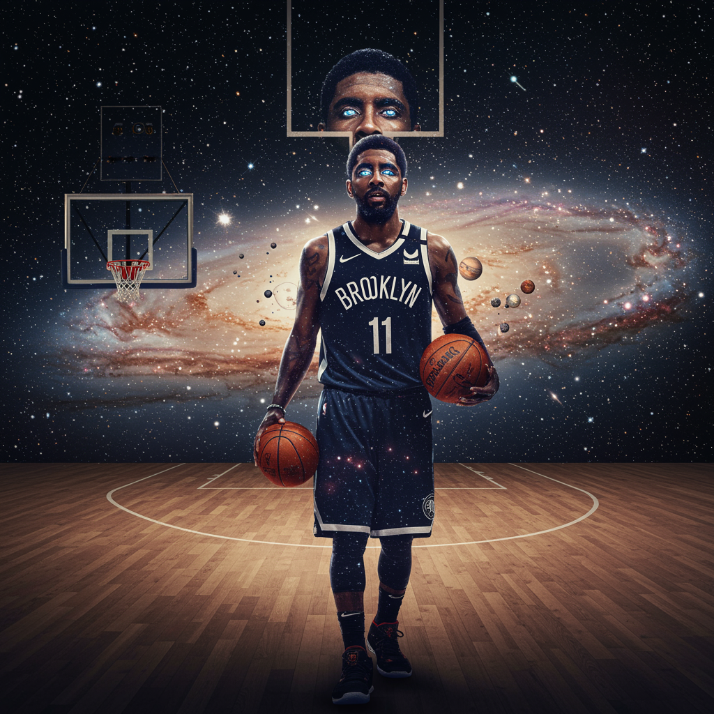 Envision an ethereal basketball court suspended in a galaxy where the cosmos reflects off the polished wooden floor, and at the center stands Kyrie Irving, not as a mere athlete but a mystic warrior. His eyes glow with cosmic wisdom, a swirling nebula encapsulated within each iris. Behind him, the hoops are made of intertwined shooting stars, and his aura is a picturesque amalgam of moonlit shadows and pulsating starlight. Clutched in his hand is a basketball orbited by tiny planets, symbolizing his gravitational influence on the game. This captivating character embodies the enigmatic nature of Kyrie, with an expression that exudes both serenity and intense focus, perfect for a profile picture that marries the celestial with the earthbound.