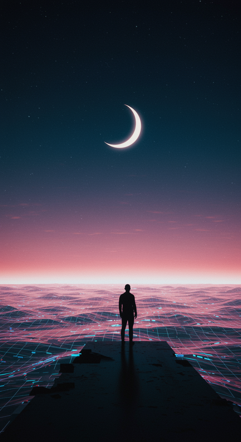 An enigmatic and surreal profile picture depicting a lone figure standing at the edge of a digital landscape, where the horizon blends into a kaleidoscope of glitchy patterns and ethereal colors; the figure's silhouette is illuminated by the soft glow of a crescent moon that casts a dreamlike sheen, reflecting the mysterious aura of introspection and the hidden depths of the virtual realm, embodying the essence of solitude and infinite possibility.