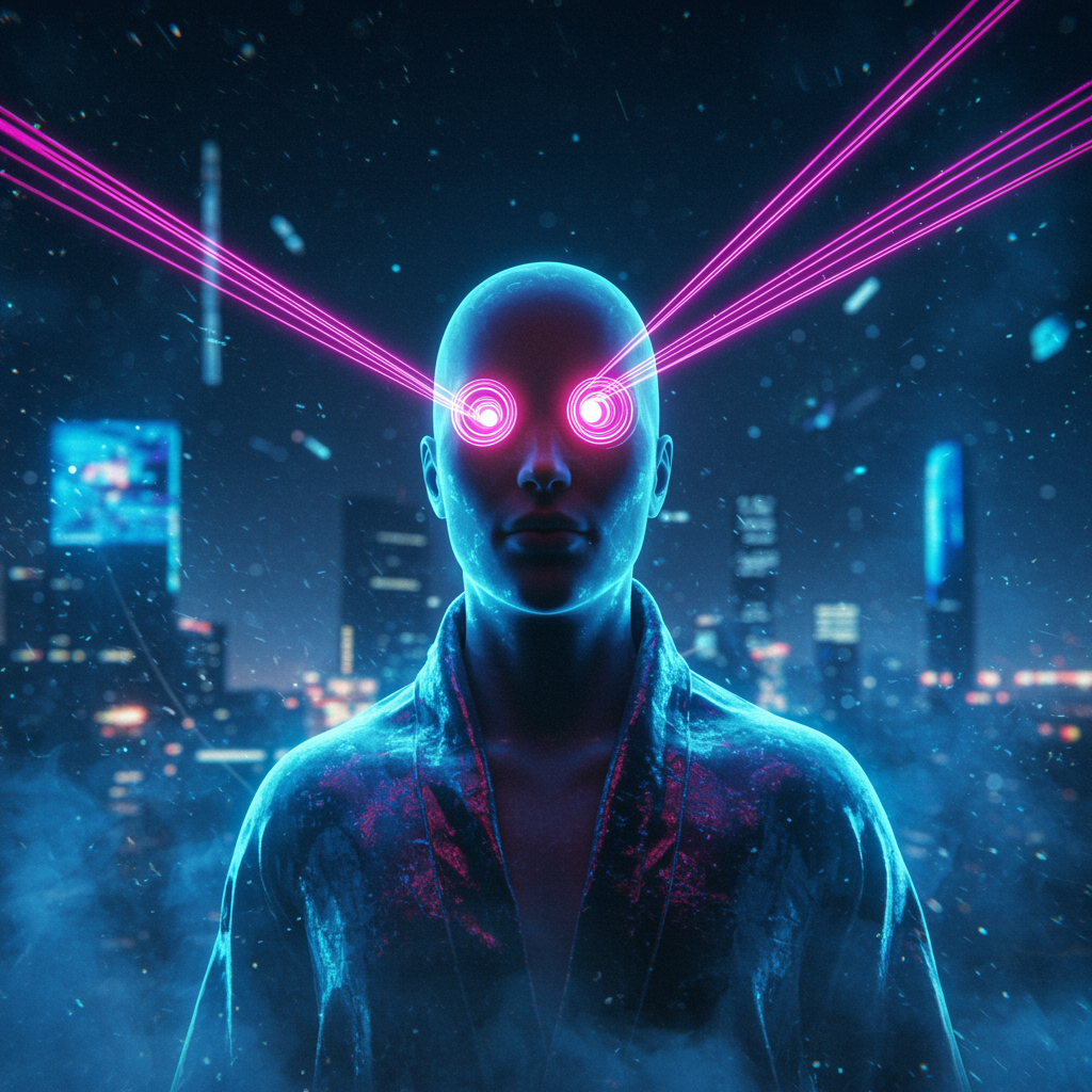A futuristic humanoid figure with luminescent skin, eyes emitting vibrant laser beams that project a spectrum of kaleidoscopic patterns, stands against a digital cityscape backdrop. The figure is cloaked in a sleek, reflective silver robe that shimmers with every movement, its edges outlined by subtle, flickering neon lights. The atmosphere is thick with swirling mists of electric blue and indigo hues, creating an otherworldly aura. In the distance, holographic structures pulse rhythmically, syncing with the radiant beams from the figure’s eyes. This image captures a blend of otherworldly technology and enigmatic presence, perfectly encapsulating the persona of "Lazer Dim 700."