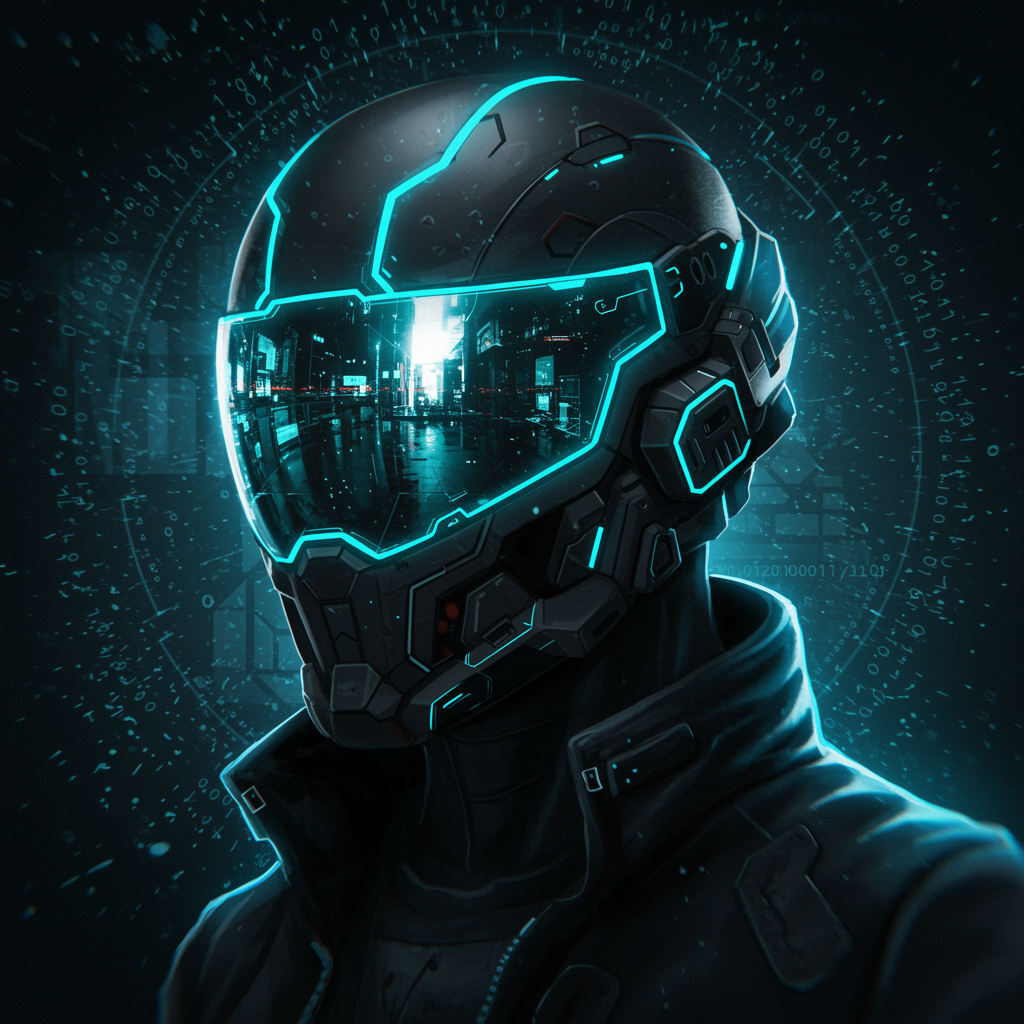 A futuristic cyberpunk avatar exuding an air of mysterious authority, donning a sleek black helmet with neon blue accents glowing ominously in the dim light. The visor reflects a bustling cityscape, hinting at a world of intrigue and danger. The background is a whirlwind of abstract digital codes and symbols, suggesting a hidden connection to a powerful and secretive organization. The avatar’s sharp, angular features, combined with a slight, knowing smirk, convey both confidence and an untamed energy, capturing the essence of a lethal company masterfully.