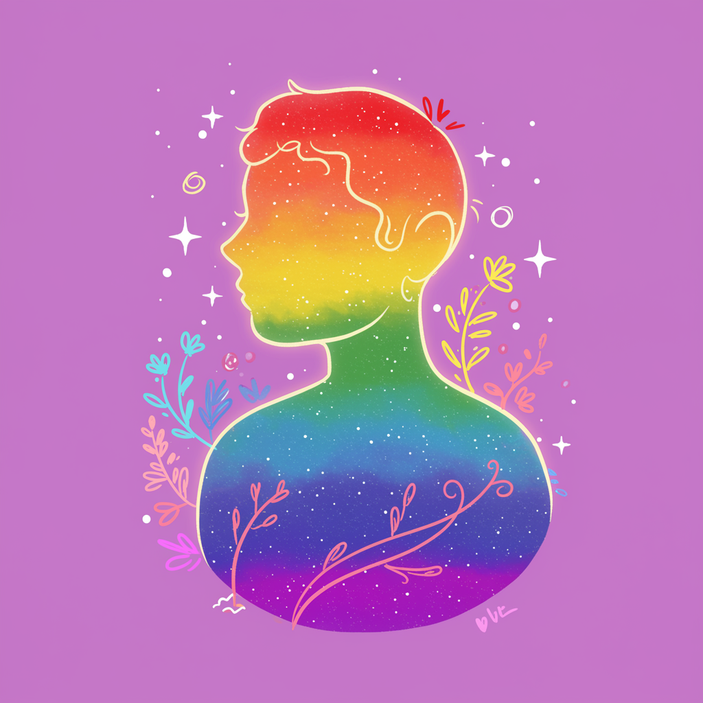 Create a vibrant and expressive profile picture that captures the essence of diversity and pride, featuring a whimsical fusion of rainbow colors that blend seamlessly into a human silhouette with softly glowing edges; the background is a celestial tapestry speckled with tiny stars and abstract shapes symbolizing unity and acceptance, while subtle elements of nature, like intertwining vines and blooming flowers, wrap around the figure, embodying growth and love within the LGBTQ+ community.