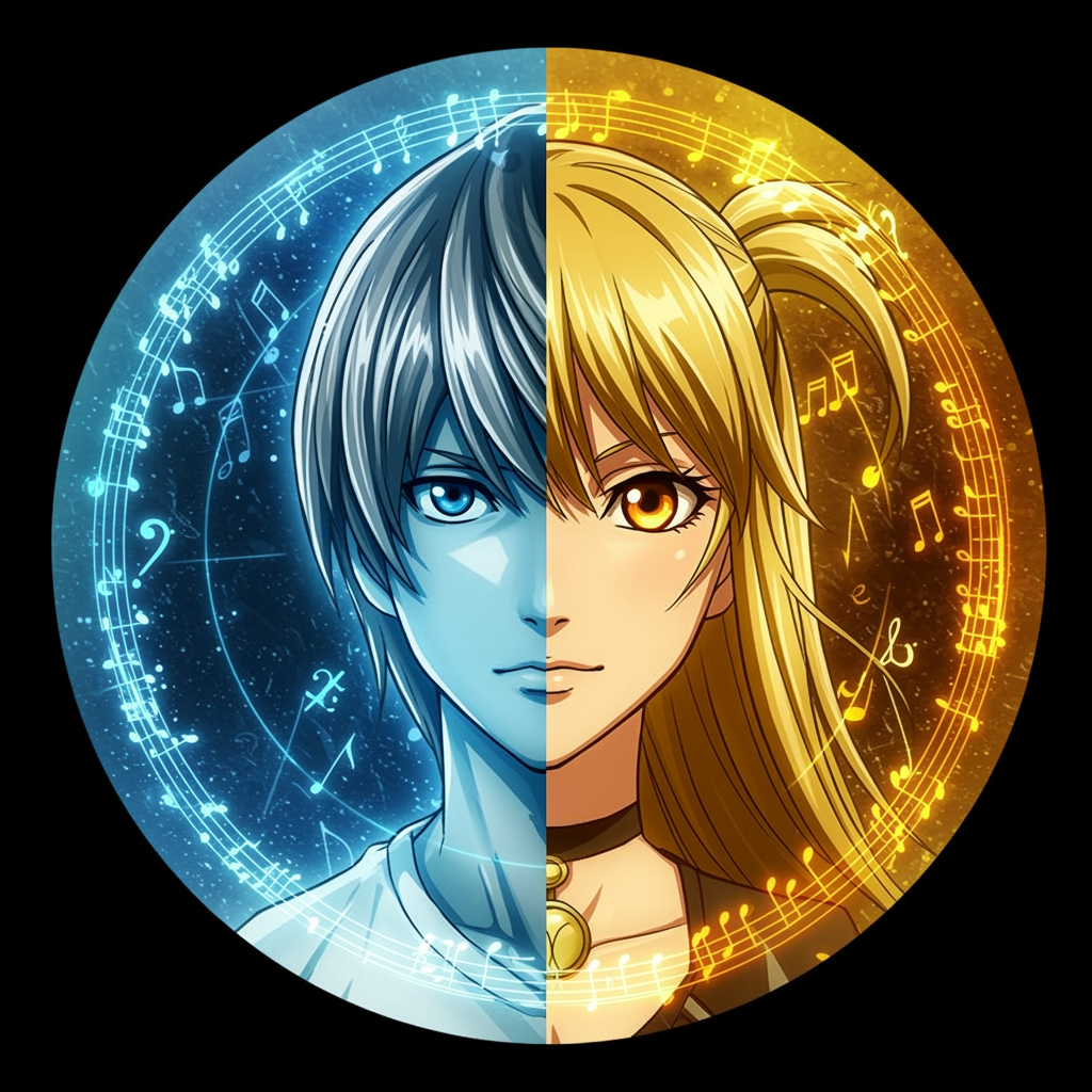 A captivating digital artwork depicting a split-image profile featuring two anime-inspired characters, Light and Misa, each occupying half of the circular frame. Light's side is bathed in a serene, cool glow, with soft blue and silver hues suggesting intellect and calm, his expression contemplative and focused. On the opposite half, Misa's side radiates with warm, golden tones, her eyes sparkling with mischief and confidence, framed by a cascade of golden locks subtly adorned with musical notes. The background seamlessly blends these contrasting light palettes, creating a harmonious balance between the characters, symbolizing their contrasting yet intertwined destinies.