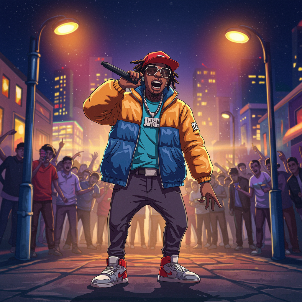 A vibrant and dynamic profile picture for a social media account inspired by the energetic persona of Lil Mabu, featuring an animated street scene where a young, stylish rapper with bold fashion choices and distinctive accessories is performing under colorful graffiti art with a backdrop of city lights and an enthusiastic crowd, capturing the essence of urban music culture and youthful exuberance.