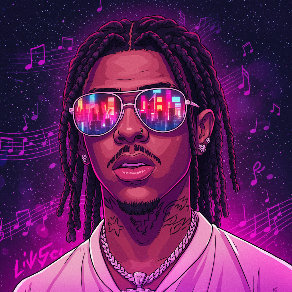 A vibrant, animated portrait of Lil Tecca with futuristic sunglasses reflecting a neon cityscape, his iconic braids weaving through a cosmic background filled with musical notes and digital elements, capturing the essence of a digital artist in the age of technology.
