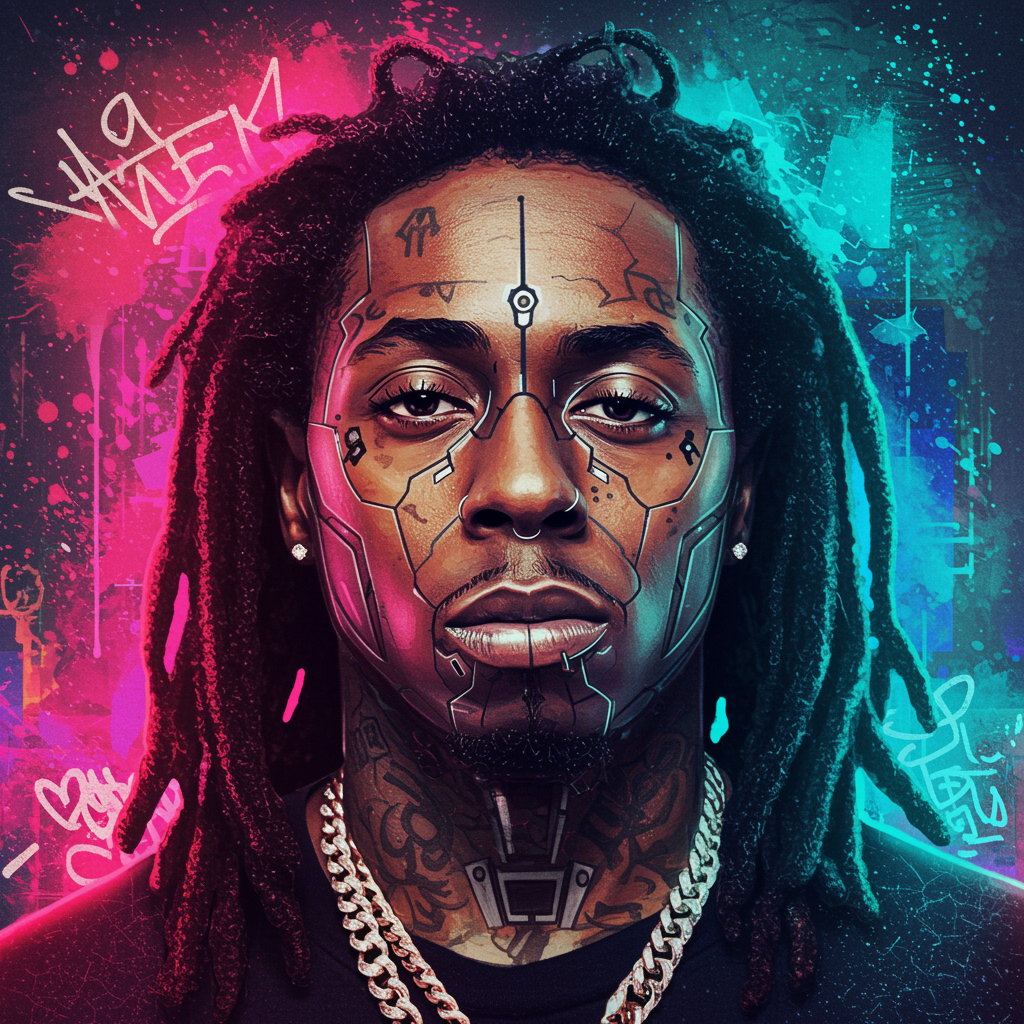 Create an image of Lil Wayne as a futuristic cyborg, with intricate metallic face details and glowing neon dreadlocks, set against a vibrant digital cityscape. The background should be a blend of pulsating electric colors and abstract graffiti, to convey a sense of both technological advancement and urban street culture. Lil Wayne's cybernetic eyes should subtly hint at wisdom and intrigue, capturing an enigmatic aura that draws viewers in. This image should encapsulate his influence in the music industry while giving a nod to his artistic evolution, perfect for a striking and memorable profile picture.