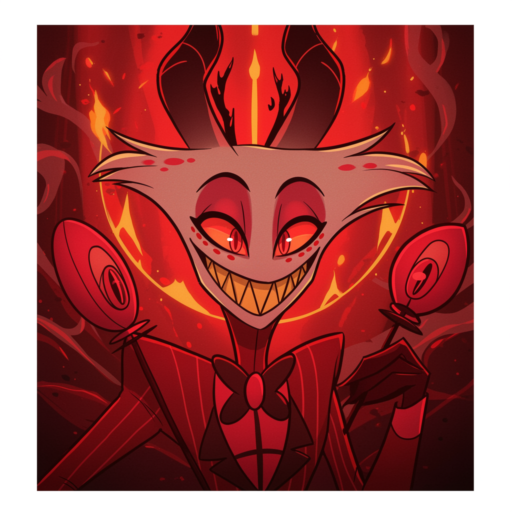 A vivid illustration of Lucifer from Hazbin Hotel as a striking profile picture, capturing his charismatic and devilishly charming essence with an intricate mix of vibrant reds, deep blacks, and golden accents. His eyes, glowing with an otherworldly wisdom, pierce through the image, set against the backdrop of an opulent, hellish landscape. His mischievous smile and elegantly poised devil horns add to his enigmatic allure, while the subtle presence of flames and swirling smoke lend a dynamic, fiery energy, creating a captivating and memorable portrayal perfect for a unique social media presence.