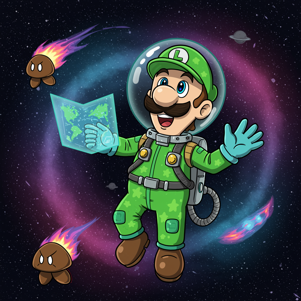 A whimsical digital illustration of Luigi as an intergalactic explorer, wearing a futuristic, neon green spacesuit adorned with glowing pixelated stars. His signature mustache and cap are intact, but his expression is one of awe and excitement, as he hovers in zero gravity amidst colorful, swirling galaxies and mischievous comet-like creatures that resemble Goombas. A small, holographic map projects from his glove, guiding him on an epic cosmic adventure, capturing his brave yet playful essence perfect for a unique pfp.