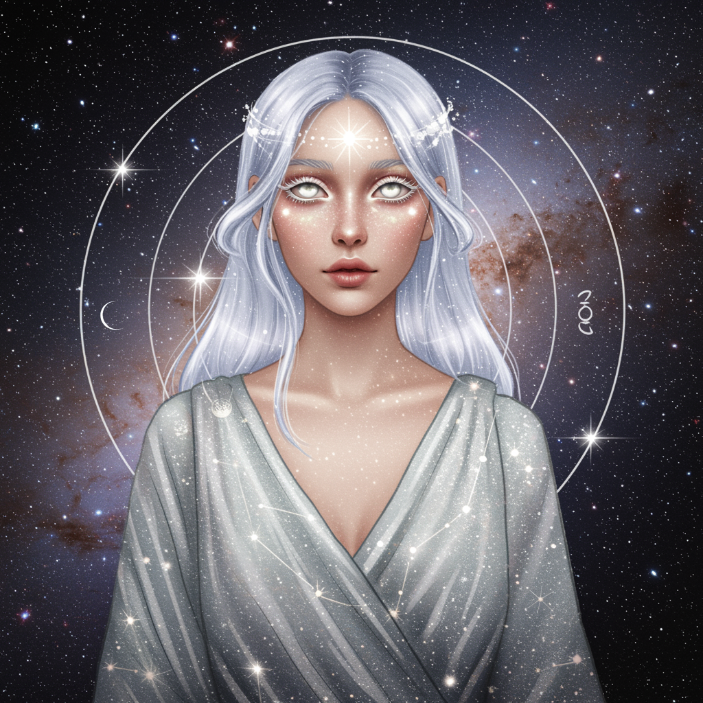 Imagine a mystical avatar for a user named Lumi Athena, embodying the essence of ancient wisdom and celestial wonder. The image portrays a luminous goddess-like figure with captivating, ethereal eyes that hold the secrets of the universe. She is adorned in a shimmering silver robe woven with threads of stardust, reflecting delicate patterns of constellations. Her hair flows like liquid moonlight, framing her serene face. In the background, an otherworldly sky filled with swirling galaxies and twinkling stars hints at the infinity of the cosmos. This enchanting PFP captures a blend of Greek mythology and cosmic elegance, a perfect emblem for someone who wants to exude a sense of profound intelligence and celestial beauty on social media.