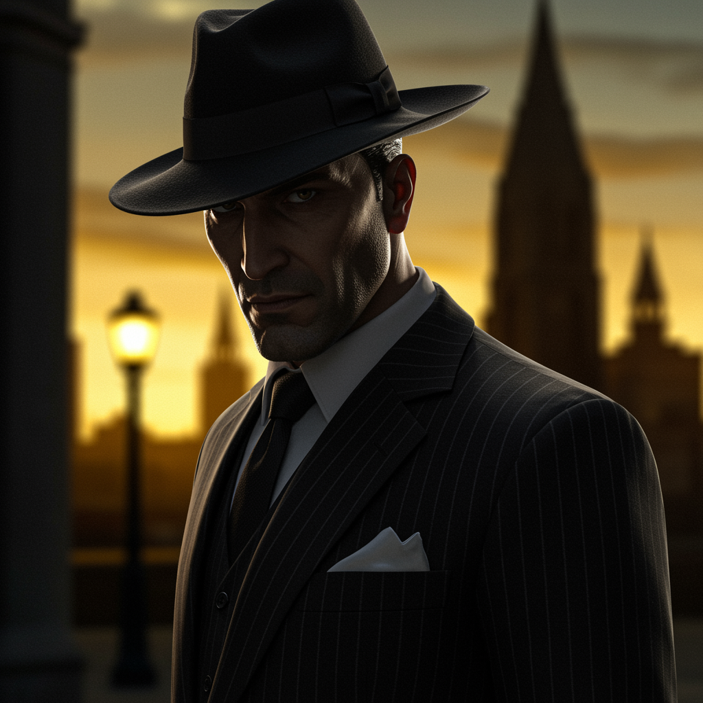 A sleek, enigmatic character with piercing eyes hidden beneath a classic fedora, exuding an aura of mystery and authority, clad in an impeccably tailored pinstripe suit, with the shadowy silhouette of a vintage cityscape in the background, softly lit by the golden glow of a distant streetlamp, capturing the essence of a modern mafioso emerging from the shadows, poised with a charismatic yet dangerous charm.