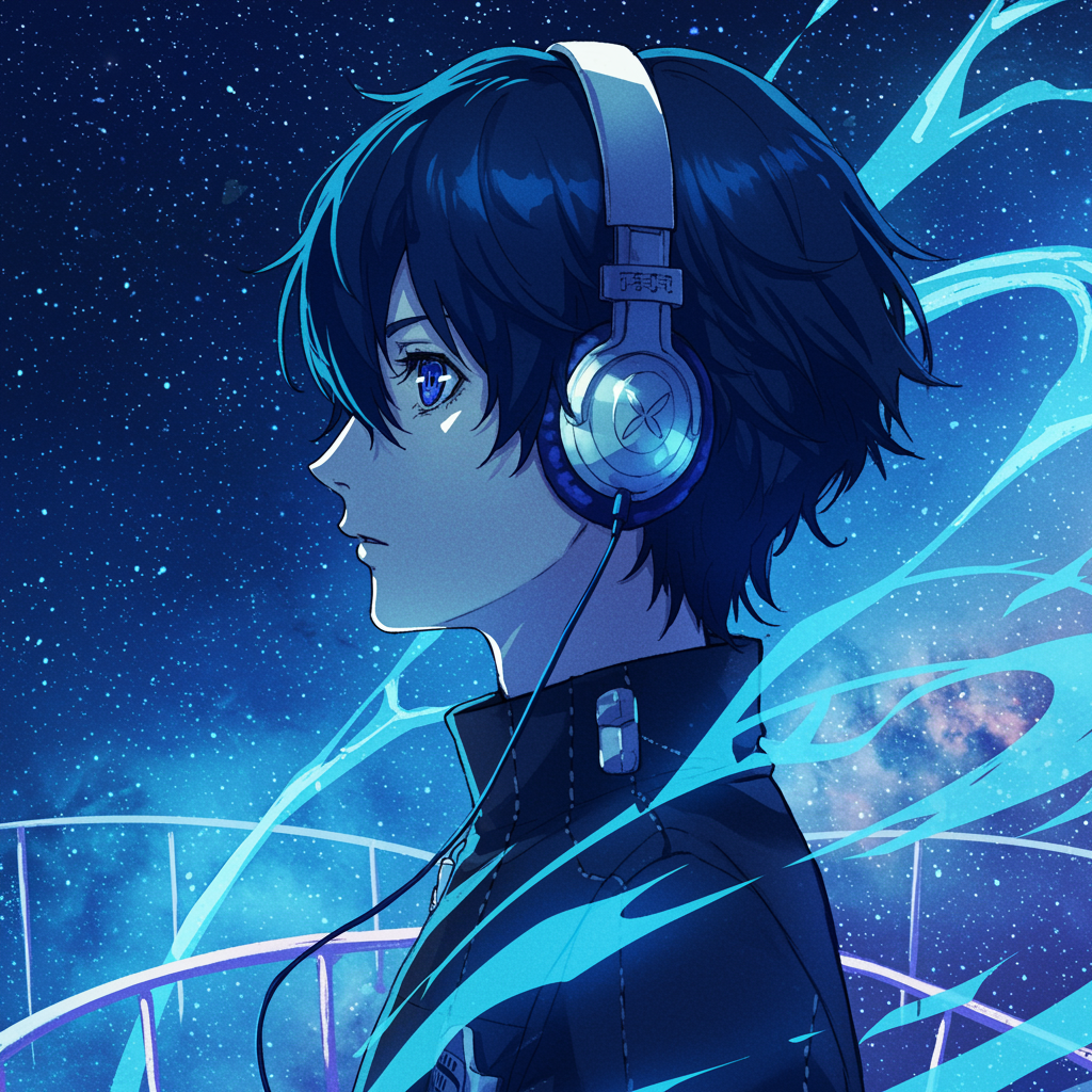 A vibrant, otherworldly profile picture of Makoto Yuki, the iconic protagonist from Persona 3, standing on a cosmic bridge between realms; his headphones nestled against a cascade of midnight blue hair, eyes reflecting a galaxy of stars, while ethereal wisps of blue surrounds him, hinting at the silhouette of his Persona, Orpheus, in a seamless blend of mystique and modernity, capturing the enigmatic allure of a journey between reality and the subconscious.