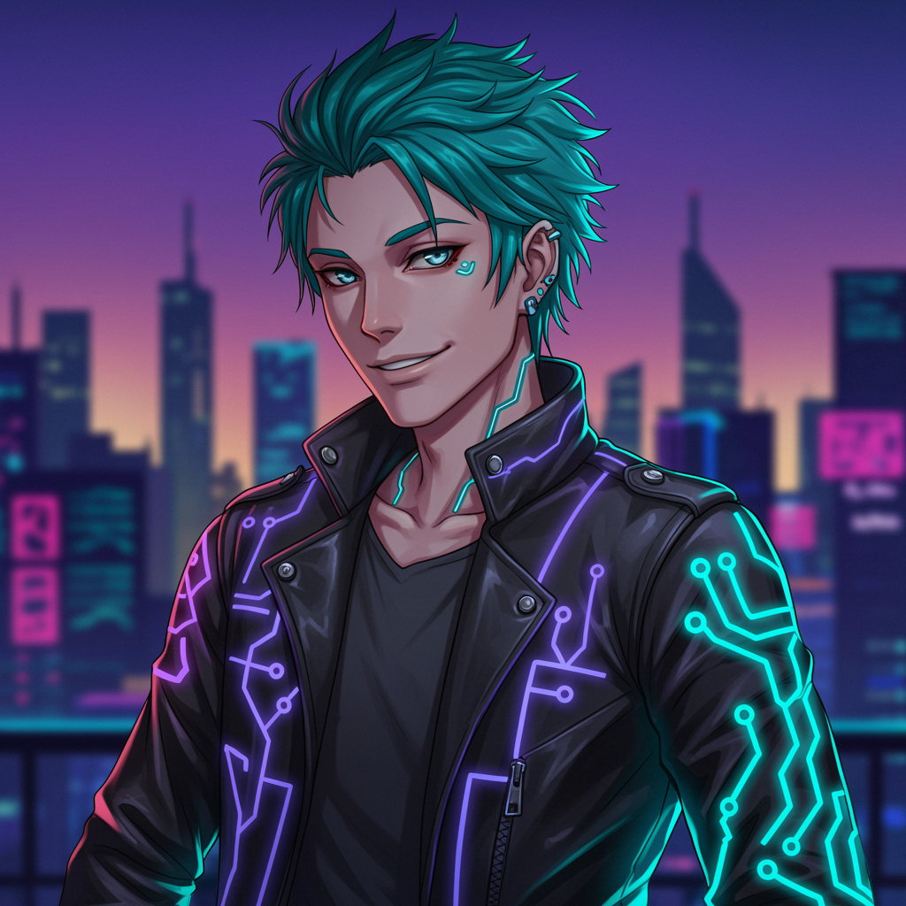 A youthful male anime character with striking teal hair and silver eyes, wearing a futuristic leather jacket adorned with neon circuit-like patterns, stands against a backdrop of a digital cityscape glowing in the twilight. His confident smirk and mischievous gaze exude a sense of adventure and mystery, while hints of cybernetic enhancements on his right arm and ear suggest a deeper connection to the high-tech world around him.