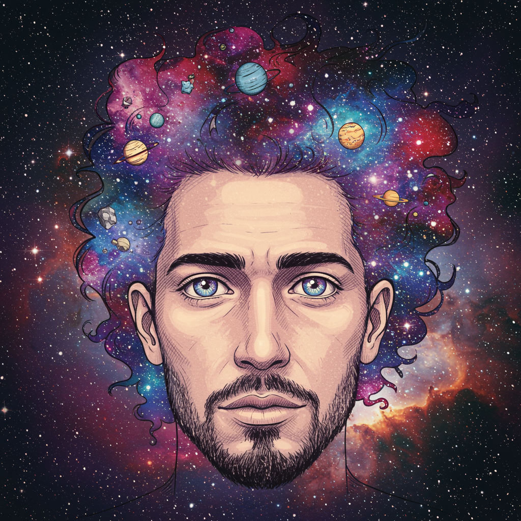 A whimsical portrayal of a man with a cascade of cosmic elements flowing through his hair, eyes twinkling like distant galaxies with a serene expression that conveys wisdom and curiosity, set against a surreal backdrop of swirling nebulae and glistening stars, embodying the infinite universe contained within the essence of his being.