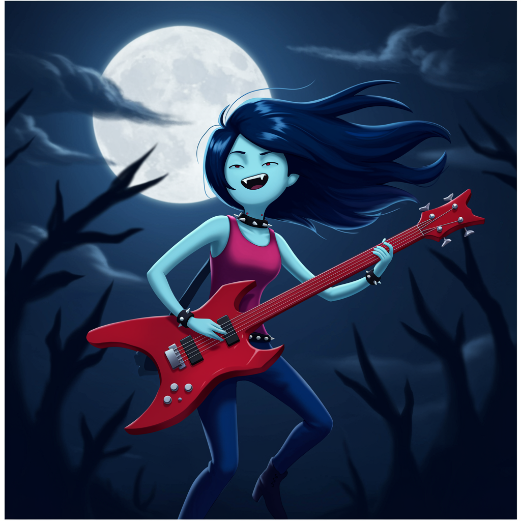 A mesmerizing profile picture captures Marceline, the Vampire Queen, in a dynamic pose. She's serenading the night with her iconic red axe-bass guitar under a silver moon, casting a faint glow on her striking blue skin and jet-black hair flowing like ink through the dark sky. Her eyes gleam with a rebellious spirit as the shadows of trees dance around her in a haunting yet enchanting symphony, mixed with the vibrant hues of her rocker attire. This pfp breathes life into her mysterious aura and musical charisma, making it an unforgettable representation for any fan.