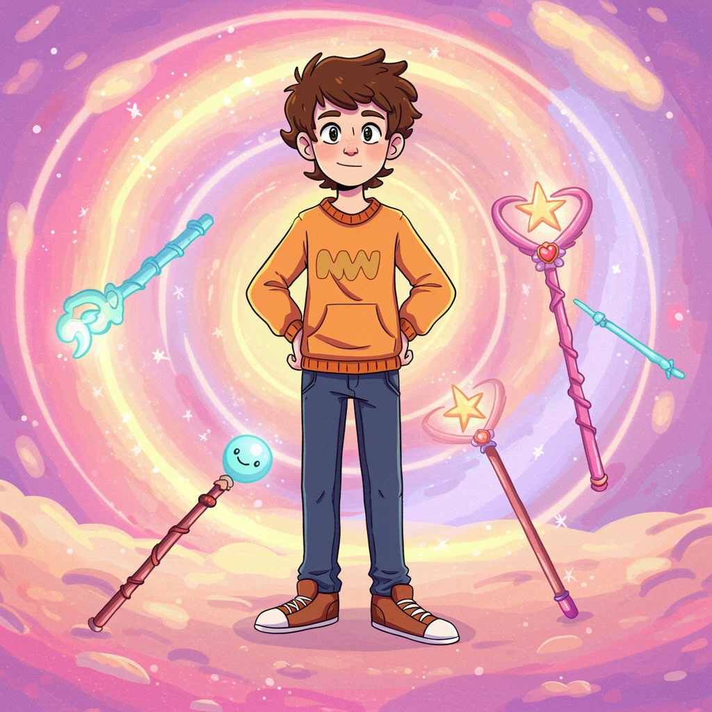 A whimsical profile picture capturing the essence of "Mashle" with a touch of surreal magic: envision a youthful character standing confidently in a vibrant, swirling world where oversized magical wands float around him like playful guardians, his expression both calm and determined as pastel-colored beams of mystical energy shimmer and dance playfully in the background, casting a lighthearted glow that reflects his unique blend of strength and whimsy, his eyes sparkling with quiet intelligence and humor, embodying the perfect balance between ordinary and extraordinary in a style that seamlessly merges anime charm with a touch of mischief.