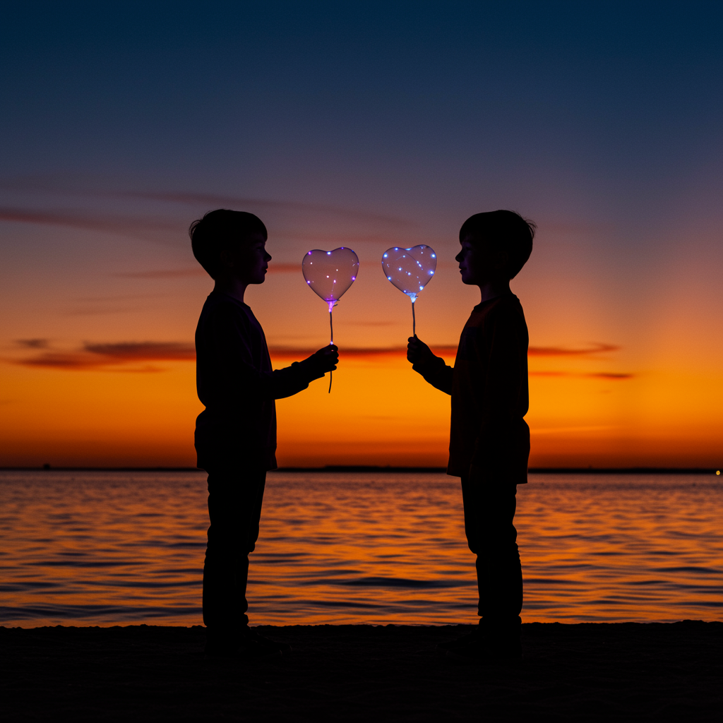 Two silhouettes against the backdrop of a vibrant sunset, standing on either side of a shimmering water's edge; each silhouette is holding a small, luminescent balloon shaped like a heart, glowing softly in the twilight. The boys gaze towards each other across the water, with their features subtly illuminated by the warm light. Their matching outfits reflect the colors of the sunset—one in deep purples and the other in fiery oranges. The mood is serene and intimate, capturing the quiet bond and connection they share as the sky transitions from day to night.