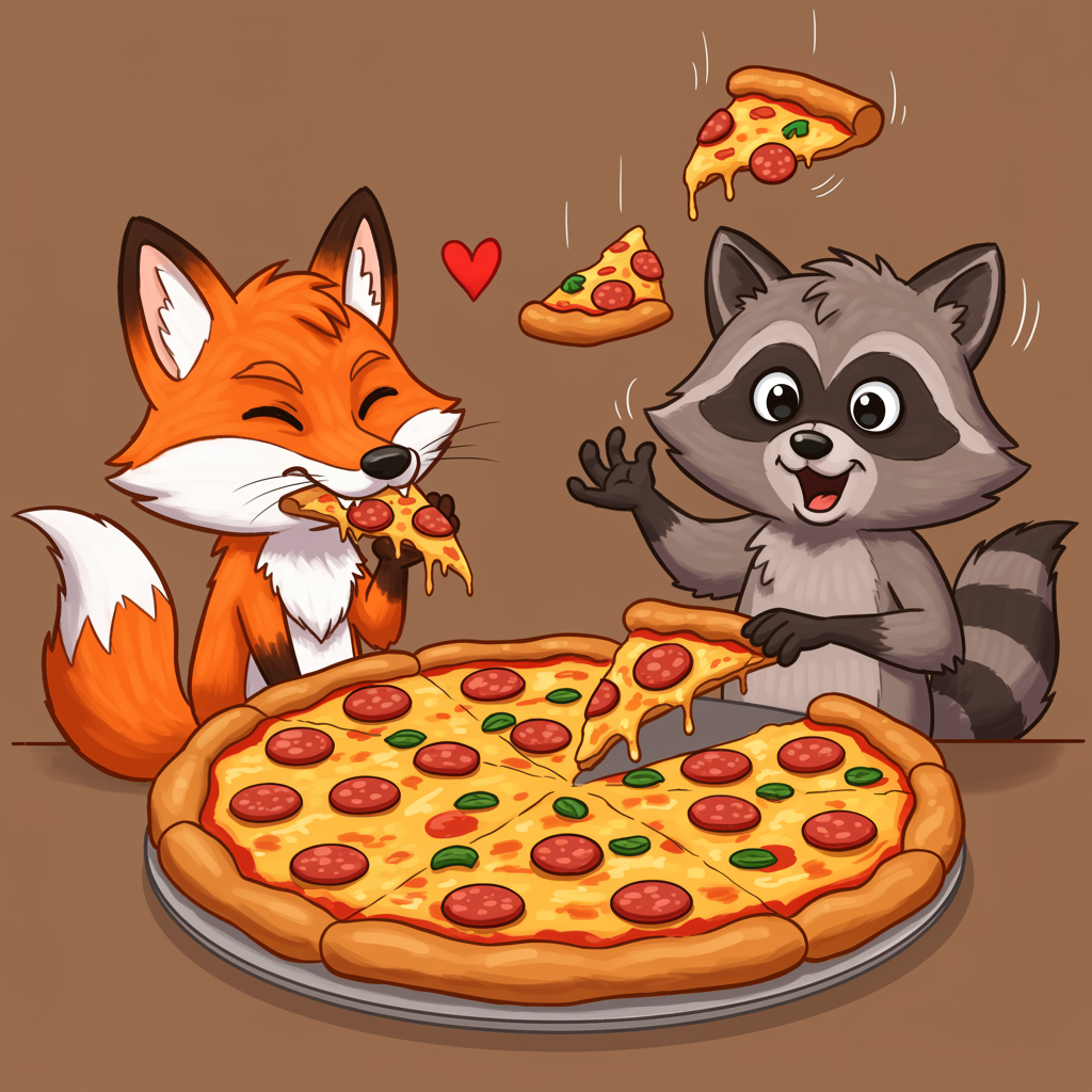 Create an illustration of two quirky, cartoon-style animal friends, like a mischievous fox and a goofy raccoon, each holding a piece of a giant pizza. The fox has a slice in his mouth with a cheeky wink, while the raccoon unsuccessfully tries to catch a falling pepperoni with a surprised expression. Their vivid, exaggerated features and playful antics make for matching, humorous profile pictures that capture their waggish camaraderie.