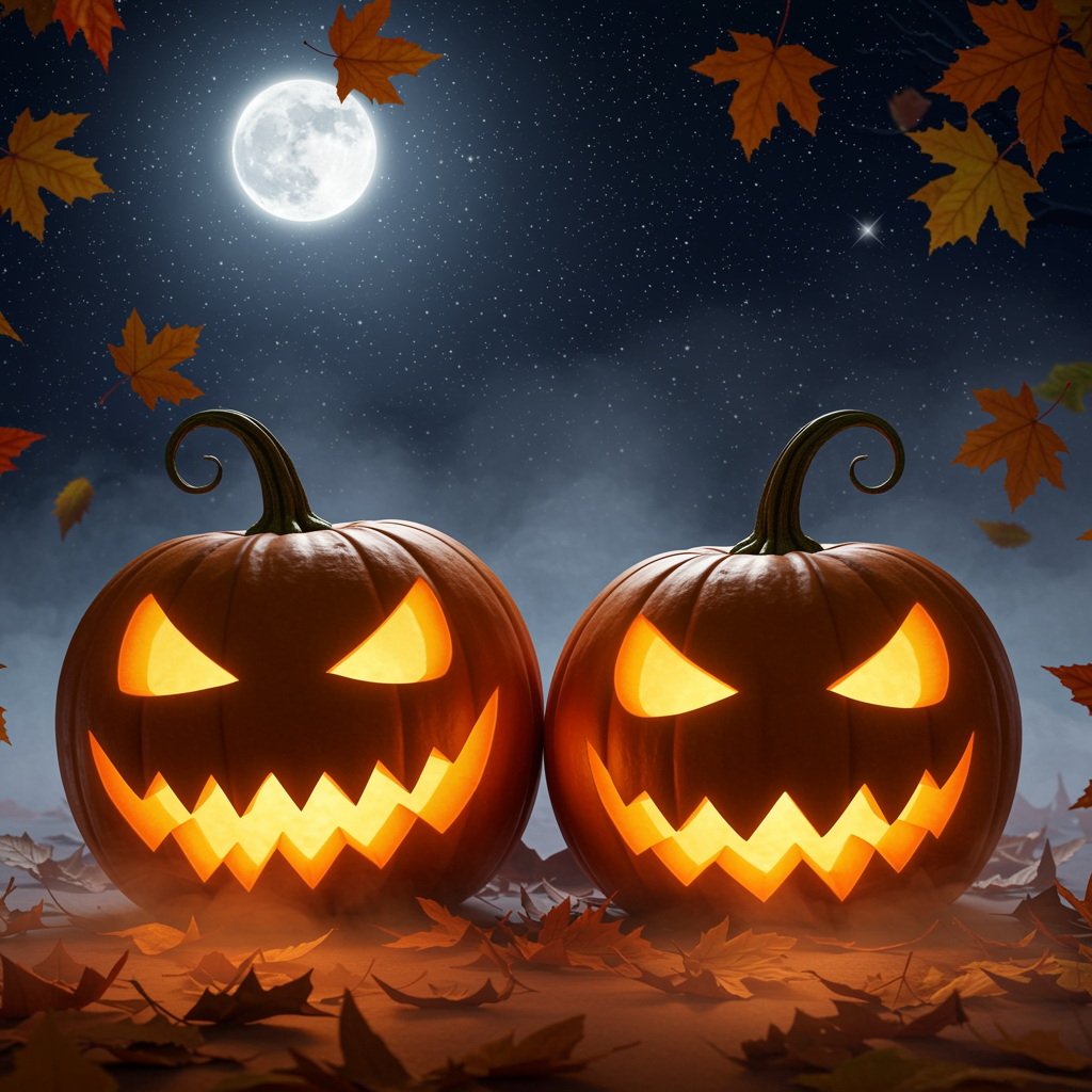 Create an enchanting image of two mirrored jack-o'-lanterns, each carved with expressive faces, one mischievously grinning and the other playfully spooky, set against a moonlit night sky filled with twinkling stars and gentle wisps of fog, surrounded by swirling autumn leaves, evoking a sense of twin spirits reveling in a mysterious Halloween night, perfectly capturing the essence of matching profile pictures with an eerie yet whimsical touch.