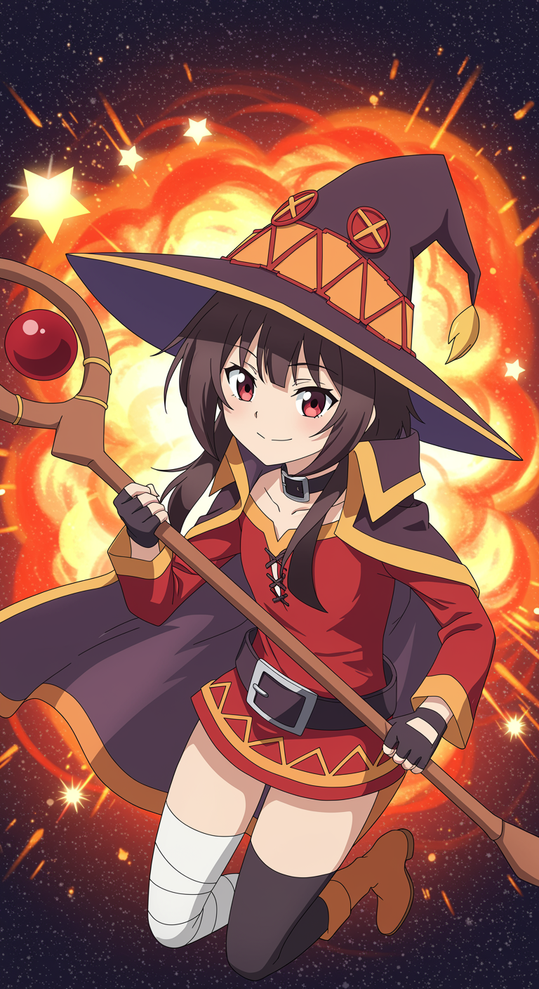 A whimsical and dynamic portrait capturing the essence of Megumin, the explosive archwizard from the anime Konosuba, depicted in a vibrant and stylized art style. Her iconic black and red witch's hat slightly tilted, casting a playful shadow over her mischievous crimson eyes. The background is an enchanting swirl of magical energy and explosions, with stars and sparks flying around, reflecting her fiery personality and arcane power. Her pose is spirited and confident, with her staff elegantly held forward, as if she’s just unleashed a powerful spell. The colors are electrifying, blending shades of red, orange, and gold to embody her explosive nature in the perfect pfp.