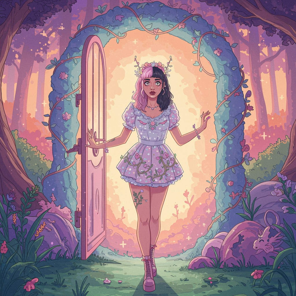 Create a whimsical and ethereal profile picture featuring Melanie Martinez inspired by her "Portals" album, depicting her in a surreal, dreamlike forest where vibrant colors swirl around her. She stands at a mystical gateway, adorned with whimsical, otherworldly fashion elements that blend nature and fantasy, with vines and flowers intertwined in her pastel-colored hair. Her expression is one of enchanting curiosity, as if on the brink of exploring a vivid, magical realm beyond the portal, capturing the essence of her unique musical persona.