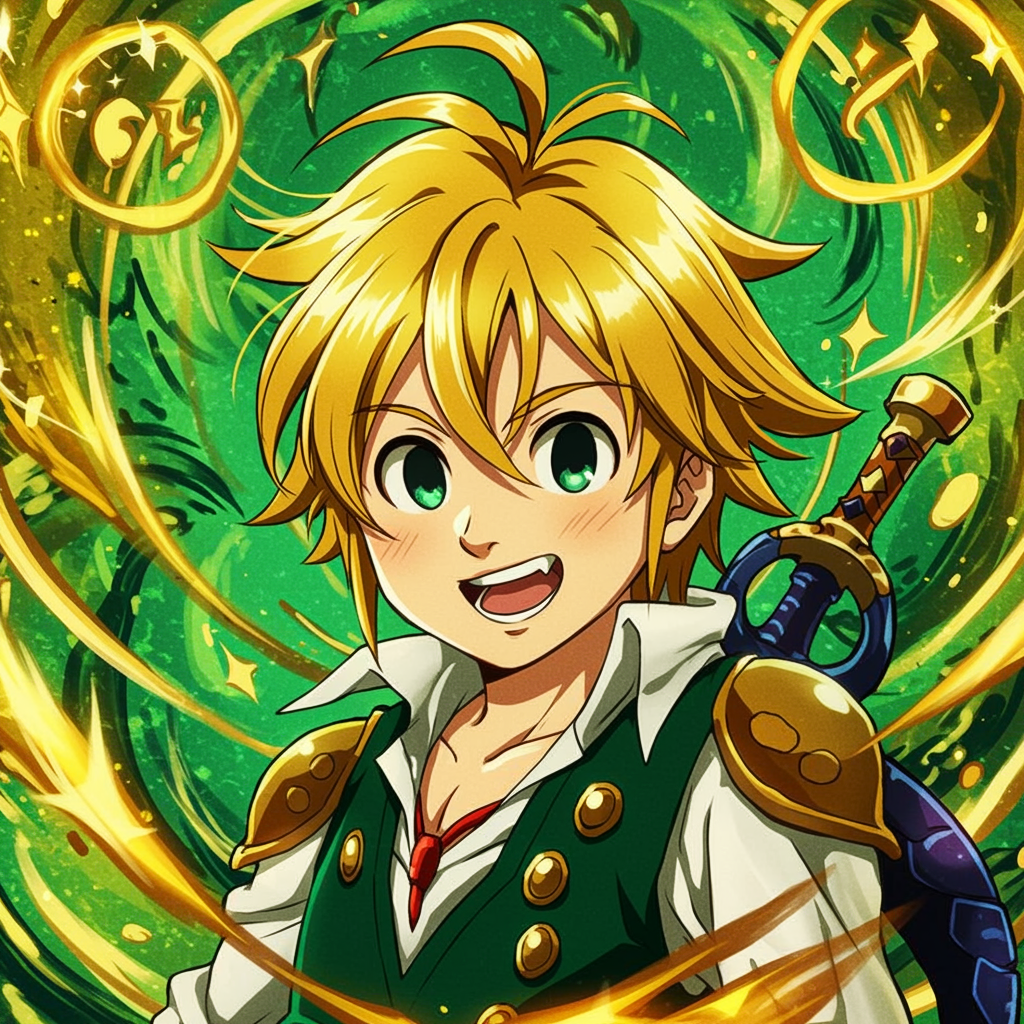 Imagine a vibrant digital illustration capturing the essence of Meliodas, the charismatic and enigmatic character from the anime world, set against a swirling backdrop of golden and emerald hues that reflect his legendary status. His eyes glimmer with a mischievous spark, framed by his signature tousled blond hair that dances in the virtual breeze. The profile picture subtly incorporates elements of fantasy, with hints of shimmering weaponry and ethereal symbols faintly visible around the edges, symbolizing his connection to a world of magic and adventure. This pfp balances a playful demeanor with a hint of mystery, inviting viewers to explore the layers of his personality.