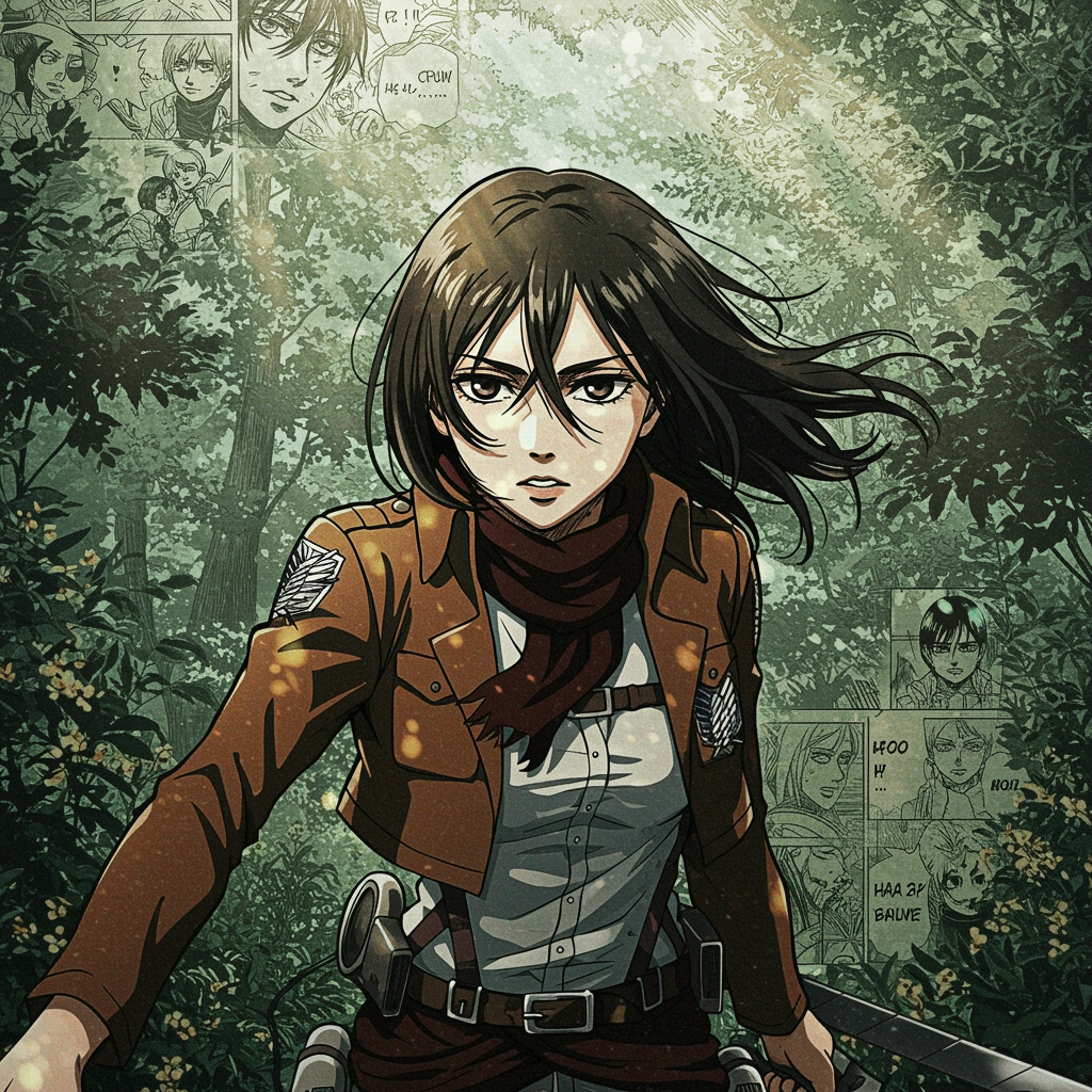 A dynamic and striking profile picture capturing Mikasa Ackerman in an ethereal forest setting where rays of sunlight filter through the leaves, highlighting her determined expression. She's clad in her iconic Survey Corps uniform, skillfully balancing between strength and grace. In the background, a collage of faded manga panels intertwines with nature, subtly showcasing her epic journey. Her eyes are intense yet reflective, suggesting resilience and an unwavering spirit while wisps of her dark hair flutter gently in the breeze, perfectly framing her face. This enchanting yet powerful image embodies her character's essence and serves as an inspiring digital emblem.