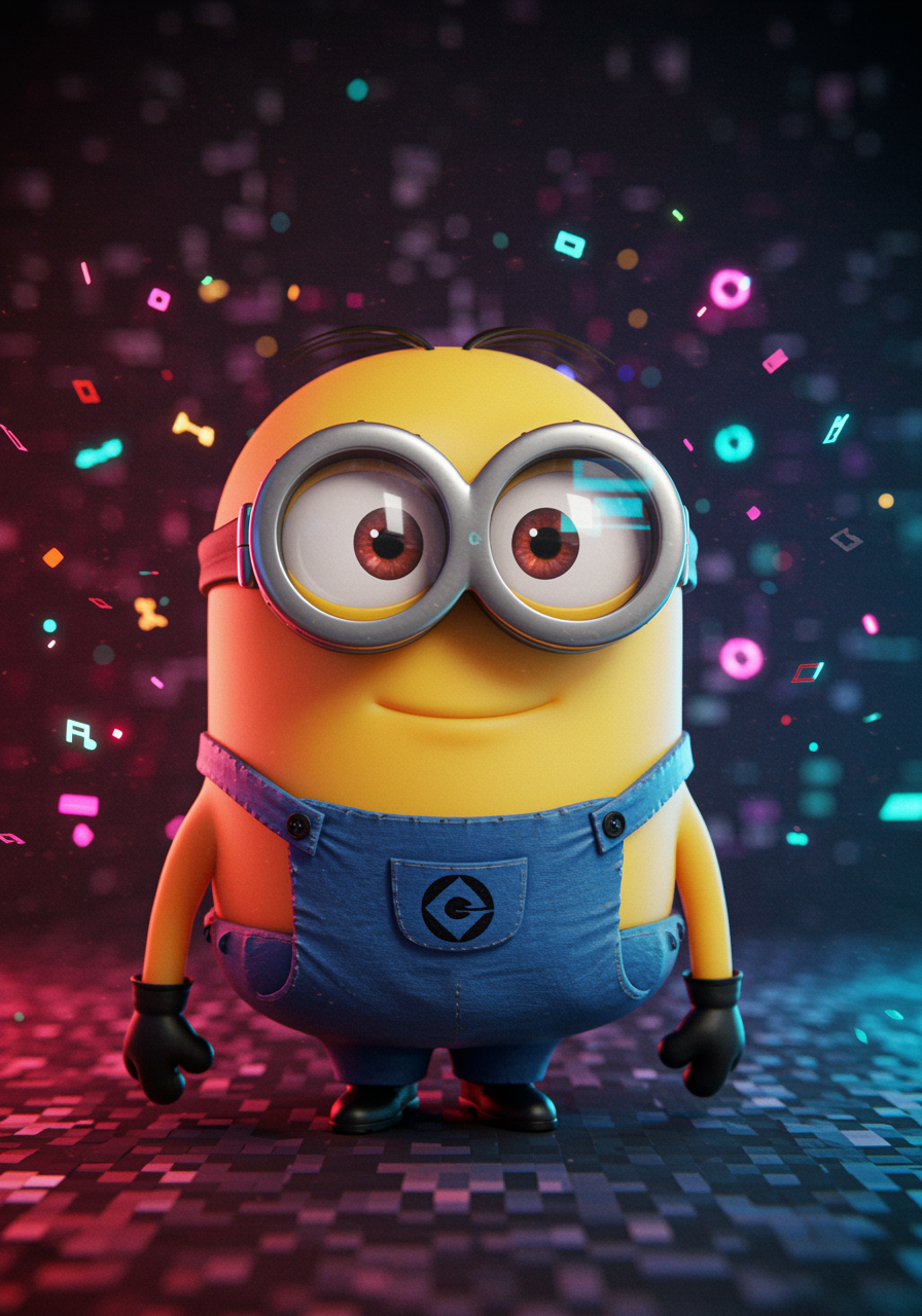 Imagine a whimsical minion character wearing futuristic cyberpunk goggles, surrounded by a glow of neon lights and tiny floating digital elements. The background is a vibrant mix of abstract patterns and pixellated effects that give a nod to the digital world. The minion's expression is cheeky and mischievous, capturing an adventurous spirit ready to take on the virtual universe.