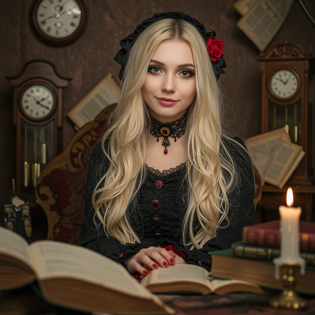 A mysterious character with long flowing blonde hair, dressed in Gothic Lolita fashion with a black lace choker and a red rose accent, sits in a softly illuminated room filled with antique clocks and scattered pages, her enigmatic smile revealing a hint of mischief and allure, as her captivating eyes reflect the glow of a single flickering candle nearby, capturing an aura of timeless elegance and enigmatic charm.