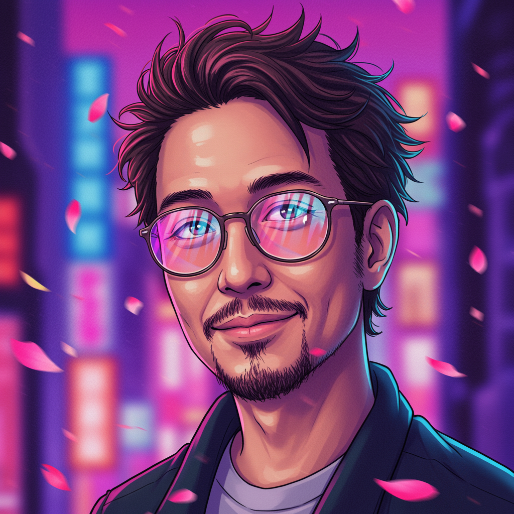 A vibrant and eye-catching illustration of Miyamura, the multifaceted artist, featuring his iconic locks of hair tousled by a gentle breeze, his glasses reflecting the colors of a neon-lit cityscape behind him; he is captured in a moment of serene contemplation, a small enigmatic smile gracing his lips, as a flurry of colorful sakura petals drift past, embodying a sense of harmony between his calm demeanor and the vibrant world he inhabits.