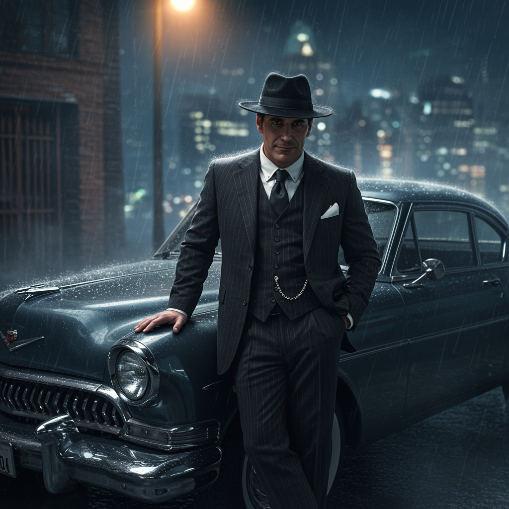 An enigmatic mob boss character leaning casually against a gleaming vintage car parked under a flickering streetlight in a dark, rain-soaked alley, with a stylish fedora casting a shadow over one eye, a subtle smirk hinting at cunning intelligence and charisma, dressed in a sharp pinstripe suit with a glistening pocket watch chain hanging from the vest pocket, the scene capturing a noir ambiance with a backdrop of distant city lights blurred by mist and the faint silhouette of towering skyscrapers, perfectly encapsulating a mysterious power and allure ideal for a "mob pfp" theme.