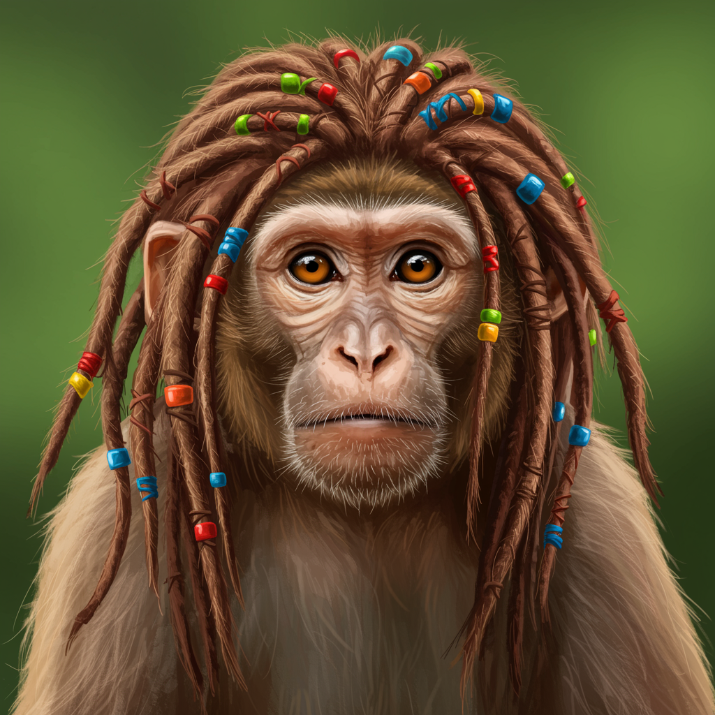 Imagine a lively, charismatic monkey with a playful glint in its eye, adorned with flowing, colorful dreadlocks that cascade down like a vibrant rainforest canopy. Its fur is a mosaic of earthy tones, reflecting the lush tropical habitat it resides in, while its dreads are interwoven with tiny, exotic beads that jingle softly in the jungle breeze. The monkey exudes an air of wisdom and mischief, a perfect avatar of creativity and uniqueness, making it an ideal representation for a profile picture that stands out with flair and individuality in the digital landscape.