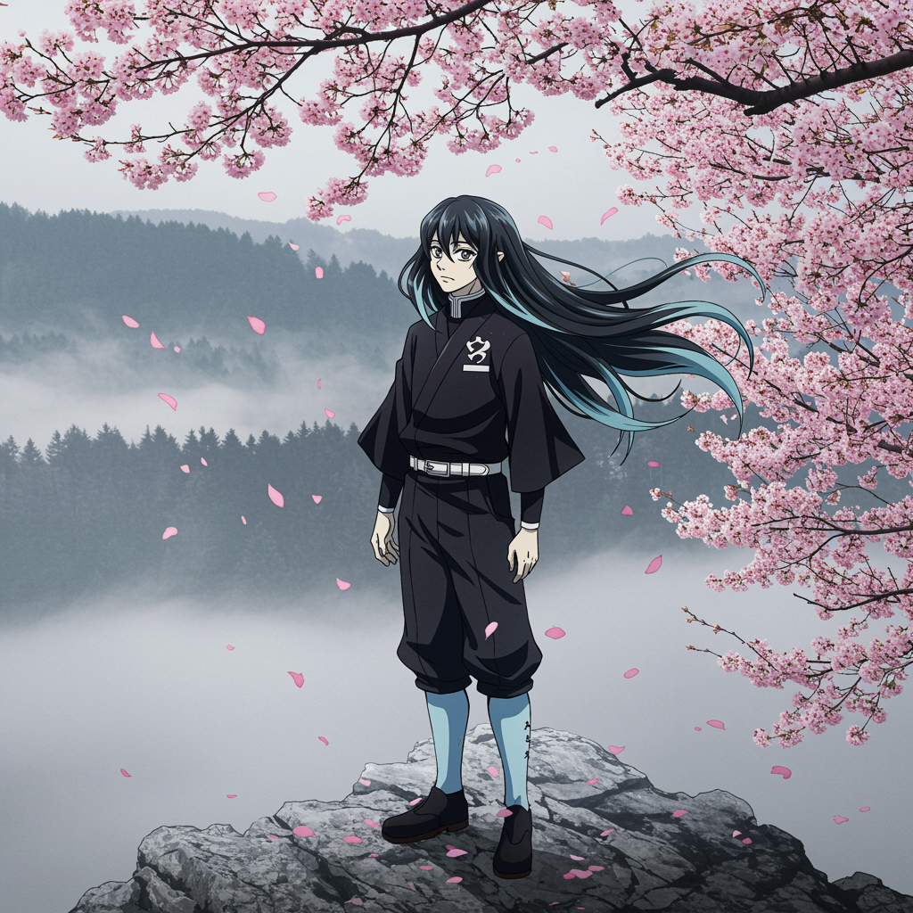 "Capture the ethereal essence of Muichiro Tokito as he stands atop a misty mountain peak, his monochrome hair flowing like a gentle breeze, surrounded by cherry blossom petals caught in a serene dance; his expression a perfect blend of stoic calm and deep contemplation, with a distant forest shrouded in fog in the background, creating an aura of mystery and introspective allure that draws you into his world."