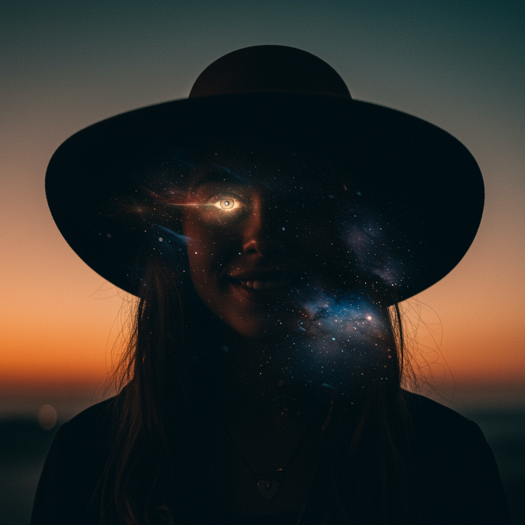A shadowy figure shrouded in mist, their eyes glinting with an enigmatic light beneath the rim of a wide-brimmed hat, surrounded by swirling cosmic patterns that hint at hidden galaxies, while a half-visible smile suggests secrets untold and stories waiting to be discovered, set against a backdrop of twilight hues that blur the boundaries between reality and dreams.