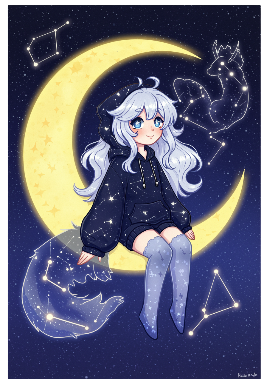 A whimsical depiction of "nagi pfp" featuring an ethereal character with flowing silver hair and starry blue eyes, wearing a celestial-themed hoodie. They're perched on a crescent moon, surrounded by glowing constellations that form mystical, mythical creatures in the backdrop. The setting radiates a serene, dreamlike atmosphere, suggesting a world where fantasy meets the cosmos, perfectly capturing the essence of a unique profile picture.