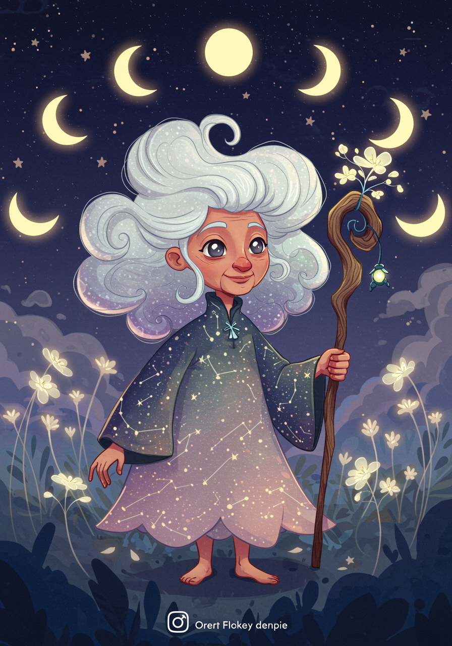 Create an enchanting profile picture featuring a whimsical character named Nana, who is a mysterious guardian of dreams. Nana is portrayed as a wise and gentle elderly woman with silvery hair that swirls like soft clouds, and eyes that twinkle with the light of distant stars. She is surrounded by an aura of shimmering colors, reminiscent of a twilight sky. Her attire is woven from the fabric of night, embroidered with tiny, glowing constellations. In her hand, she holds an ancient, wooden staff that sprouts delicate, luminescent flowers, symbolizing her nurturing spirit. The background is an ethereal garden of luminescent crescent moons and softly glowing stars, casting a serene and mystical atmosphere, inviting viewers to embrace the wonders of imagination and timeless wisdom.