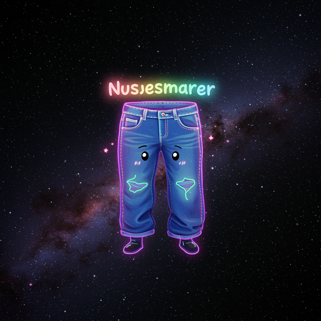 A vibrant and futuristic profile picture inspired by the iconic 'newjeans' aesthetic, featuring a pair of sleek, digitally-rendered denim pants infused with neon threads, glimmering under a galaxy of pixelated stars. The jeans, subtly anthropomorphized with a friendly smile and animated eyes, float in a space-like setting, giving off an aura of cool, contemporary style. Hovering above is a softly glowing username in a playful, handwritten font, adding a personal touch that radiates charm and individuality, making this pfp stand out in any social media horizon.