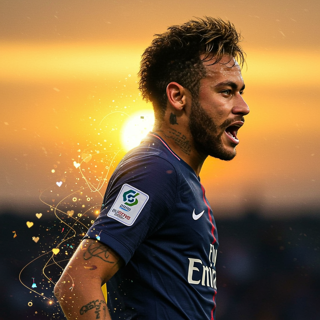 A vibrant and dynamic profile picture capturing Neymar Jr. mid-action on the football field, with the sun setting in the background casting a golden glow that accentuates his iconic hairstyle and expressive eyes. His jersey trails behind him like a superhero's cape, while tiny digital lines and symbols swirl around him, symbolizing his connection with fans and his presence in the digital world. The essence of motion is frozen in time, encapsulated in an electrifying burst of colors that merge the passion of the game with the excitement of social media interaction.