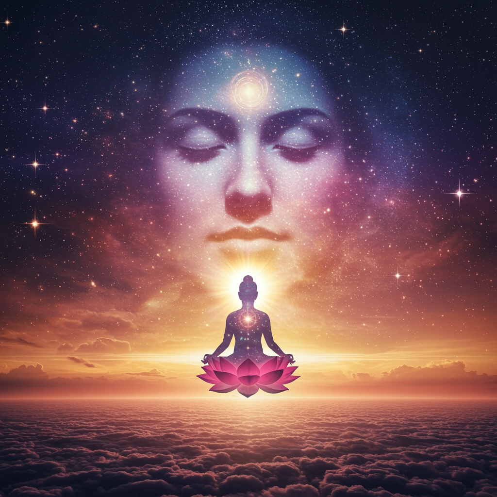 A vibrant, ethereal landscape where a serene, enlightened figure sits meditating on a floating lotus flower amidst a galaxy of swirling colors, their aura radiating tranquility and wisdom; the background is a cosmic tapestry of stars and nebulas that subtly form a peaceful face, symbolizing a nirvana state of mind, perfect for a profile picture that embodies spiritual harmony and cosmic connection.