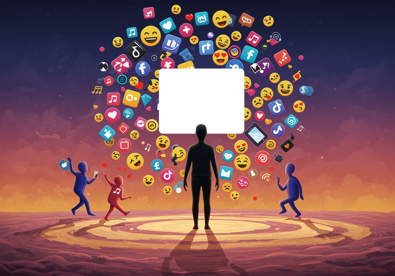 A whimsical digital landscape where a faceless figure stands amidst a swirling vortex of vibrant icons and emojis, symbolizing social media platforms, all dancing around a blank canvas with a question mark, capturing the essence of an anonymous or "no profile picture" identity on TikTok in a dynamic mosaic of color and motion.