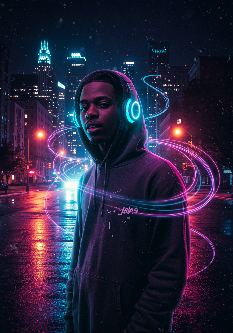 Imagine an urban nightscape teeming with vibrant colors reflected in the drizzle-specked streets, where a young rapper, embodying the spirit of Notti Osama, stands confidently in the foreground. His eyes gleam with determination and a hint of mystery, shadowed by the vibrant glow of streetlights and neon signs. He's wearing an oversized, stylish hoodie and headphones that pulse softly with LED lights matching the beats only he can hear. The city's energy and the rhythm of his thoughts swirl around him like musical notes, forming an aura that tells a story of dreams, hustle, and raw talent. Behind him, skyscrapers rise into the night sky, silhouetted silhouettes as if they too are watching him rise. This image captures a moment where music and identity blend seamlessly, embodying a modern urban legend in the making.